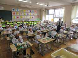 いよいよ給食の時間です。1年生は、真白なエプロンを着て、担任の先生の話をよく聞いて準備をしました。最初は担任の先生やサポートしてくれる先生方が盛り付けをしますが、やがて、自分たちで盛り付けるときがきます。今日は、緊張しながら、配膳する場所から自分の机まで、給食を運んでいました。